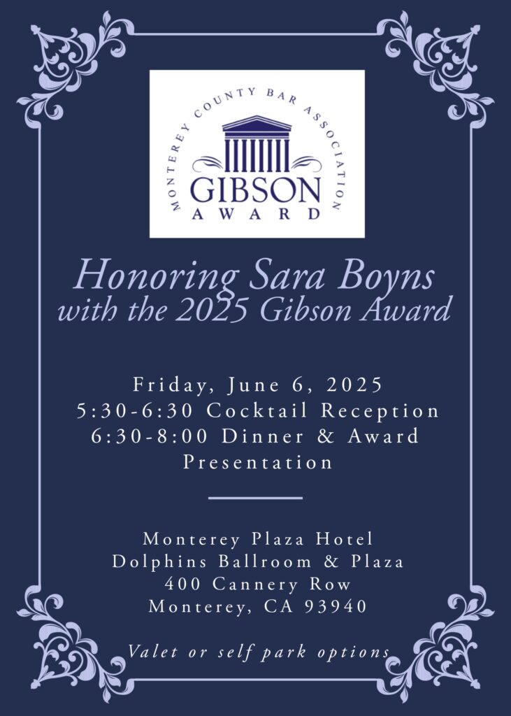 The Monterey County Bar Foundation is happy to announce that this year it has partnered with the Monterey County Bar Association to co-host the Gibson Award Dinner honoring Sara Boyns. The event will take place on June 6, 2025. MCBF welcomes donations, which will go towards a grant to the Gibson Award recipient’s favorite charity (in line with MCBF’s mission) and MCBF’s ongoing projects.